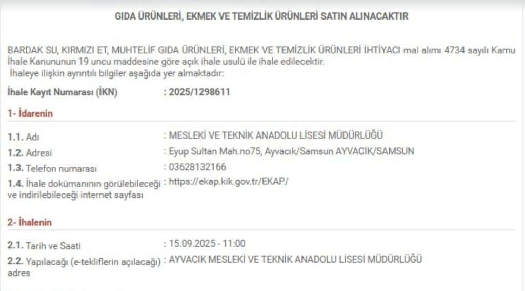Ayvacık Mesleki ve Teknik Anadolu Lisesi döner sermaye işletmesi gıda temizlik malzemesi alımı ilanı 2025/1298611 kayıt numarası ile EKAP ta 21.08.2025 tarihinde yayınlanmıştır.